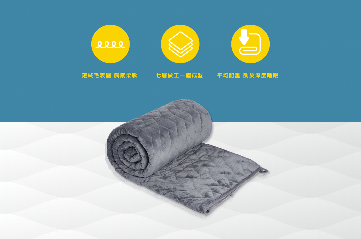最內層的玻璃並不是大家所想像如同彈珠的形狀,而是宛如流沙般、0.8~1.0mm 的極細微無鉛玻璃砂,所以不用擔心會有破碎的問題。而毯子內裏的 7 層材質設計也能有效防止玻璃砂外漏,並解決顆粒感、增加親膚性唷!
