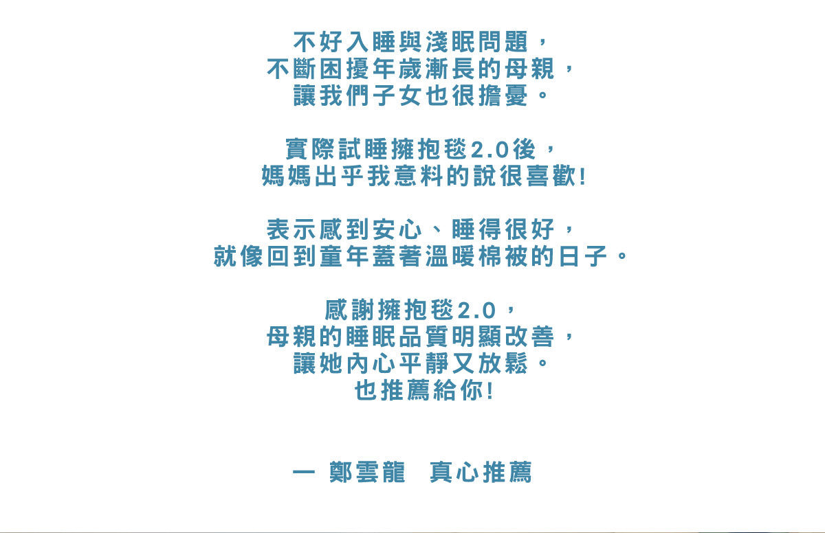淑芬 江 使用擁抱毯兩個禮拜以來,睡眠似乎有改善,不再入睡困難,雖然離正常還有一些距離,但過段時間應該會更有感。謝謝